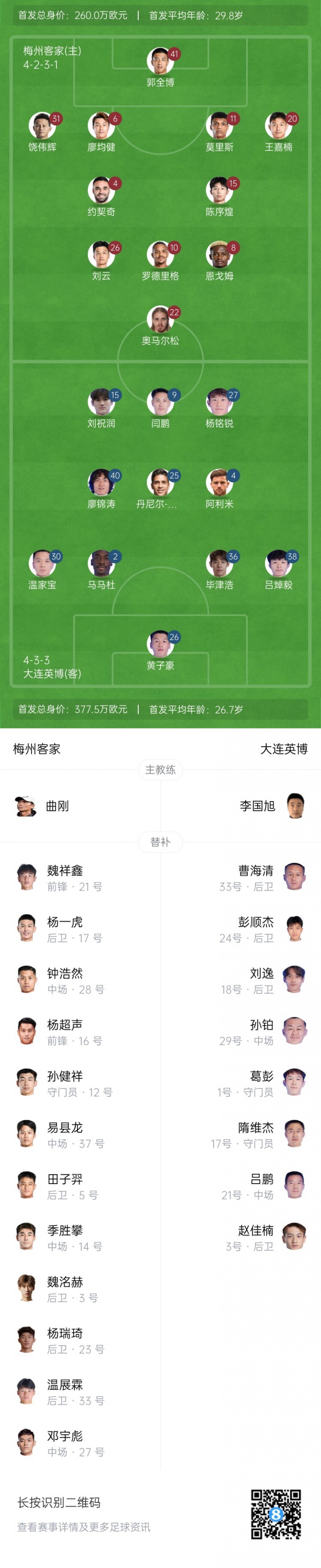 梅州vs大连首发:恩戈姆、罗德里格先发,毕津浩、吕焯毅出战
