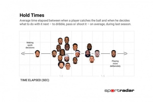 可以看到,塔图姆是最慢的,超过了1.5秒,东契奇、约基奇、詹姆斯、哈登在第二集团。