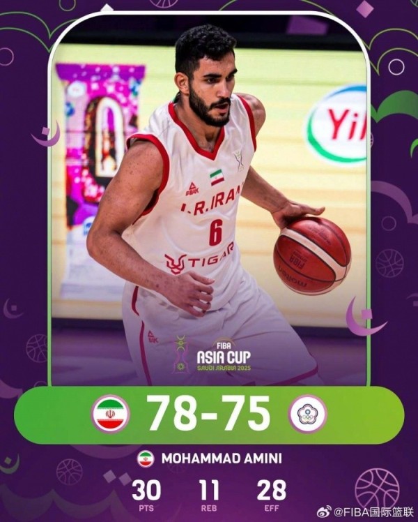 此役,伊朗球员阿米尼首发出战33分钟,投篮19中10,三分5中2,罚球12中8,砍下30分11板大号两双,另有2助1帽。他凭借优秀表现也被评为本场最佳。