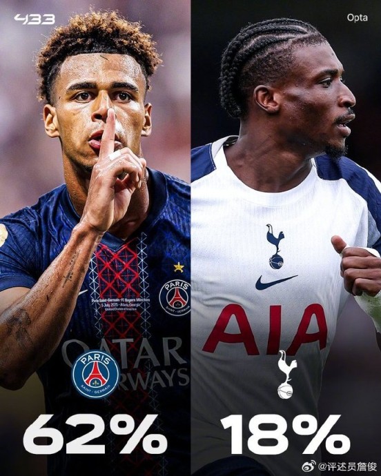 “大巴黎车轮战英超群雄的好戏从上赛季的欧冠延续到世俱杯与今晚的欧洲超级杯。都知道他们欧冠登顶的过程中淘汰了三支英超球队,但排位赛阶段他们曾经客场不敌阿森纳,16强首回合以及8强战第二回合也输给过利物浦、维拉。而世俱杯决赛大巴黎“发挥失常”被切尔西横扫,还输球又输人。这次欧超杯外界预测他们有超过60%的胜率。尽管今夏换帅后的热刺此前热身赛惨败给拜仁,但大巴黎还是要小心,热刺很可能收缩防线打防反,进攻端都是快马,也有不小的威胁。”