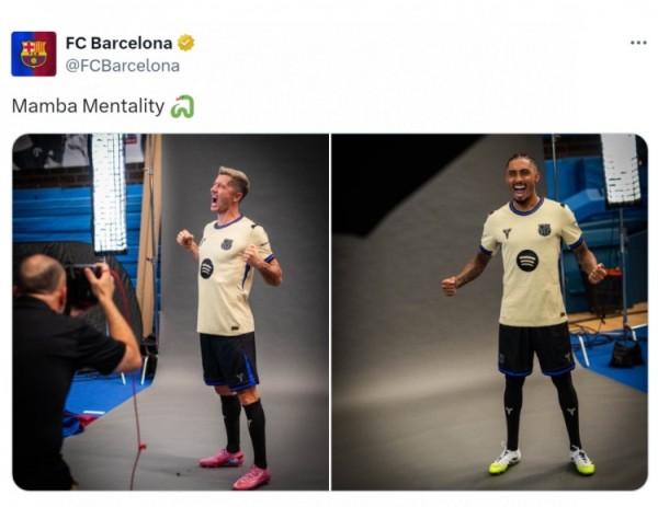 巴萨官方社媒晒出莱万、拉菲尼亚身穿科比联名球衣定妆照片,配文:“曼巴精神。”