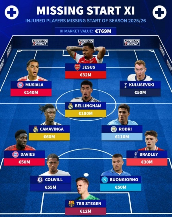 8月14日讯 德转盘点了将因伤缺席本赛季初比赛的11人阵容,其中罗德里、贝林厄姆等在列,具体如下: